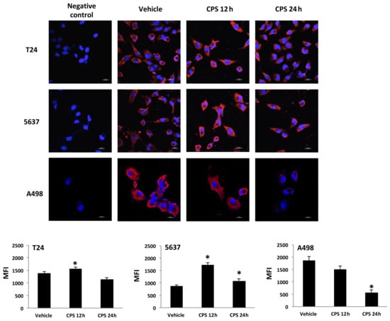 PD-L1 localization in CPS-treated cells. Confocal microscopy analysis of PD-L1 expression in T24, 5637 and A498 cells treated with CPS. Cells were stained with anti-human PD-L1 followed by Alexa Fluor-594 secondary Ab. We used 40,6-diamidino-2-phenylindole (DAPI) to counterstain nuclei. MFI = mean fluorescence intensity. Data are expressed as mean ± SEM; * p < 0.01 vs. vehicle-treated cells.