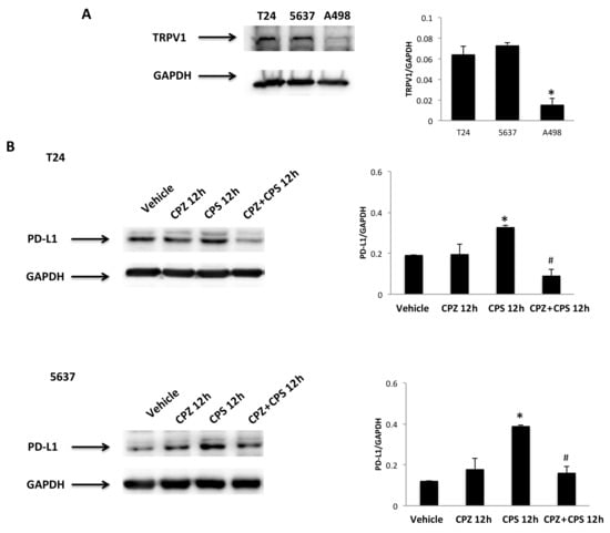 CPS treatment influences PD-L1 expression in a TRPV1-dependent manner. (A) Immunoblot representative of TRPV1 expression in T24, 5637 and A498 cell lines. TRPV1 densitometry values were normalized to GAPDH, used as the loading control. Data are expressed as mean ± SD; * p < 0.001 vs. BC cells. (B) Immunoblot representative of TRPV1 expression in T24 and 5637 cells pretreated with CPZ and then stimulated with CPS for 12 h. TRPV1 densitometry values were normalized to GAPDH, used as the loading control. Data are expressed as mean ± SD; * p < 0.01 vs. vehicle-treated cells, # p < 0.05 vs. CPS-treated cells. Detailed information about the Western blotting can be found in Figure S8.