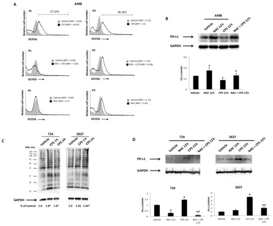 CPS influences PD-L1 protein levels via ROS production. (A) ROS generation in A498 cells pretreated with NAC for 1 h and then treated with 50 μM CPS for up to 24 h. Cells were stained with DCFDA before flow cytometric analysis. MFI = mean fluorescence intensity. (B) Immunoblot representative of PD-L1 expression in A498 cells pretreated with NAC and then stimulated with CPS for 12 h. PD-L1 densitometry values were normalized to GAPDH, used as the loading control. Data are expressed as the mean ± SD; * p < 0.05 vs. vehicle-treated cells, # p < 0.05 vs. CPS treated cells. (C) Carbonyl groups generated by oxidative stress were subjected to DNPH derivatization, and increases in oxidatively modified proteins were detected with an antibody against DNP after size fractionation followed by Western blotting. Quantification of total protein carbonylation was performed, normalizing the densitometry values to GAPDH, used as the loading control. The image is representative of three independent experiments; * p < 0.01 vs. vehicle-treated cells. (D) Immunoblot representative of PD-L1 expression in T24 and 5637 cells pretreated with NAC and then stimulated with CPS for 12 h. PD-L1 densitometry values were normalized to GAPDH, used as the loading control. Data are expressed as the mean ± SD; * p < 0.05 vs. vehicle-treated cells, # p < 0.05 vs. CPS treated cells. Detailed information about the Western blotting can be found in Figure S9.