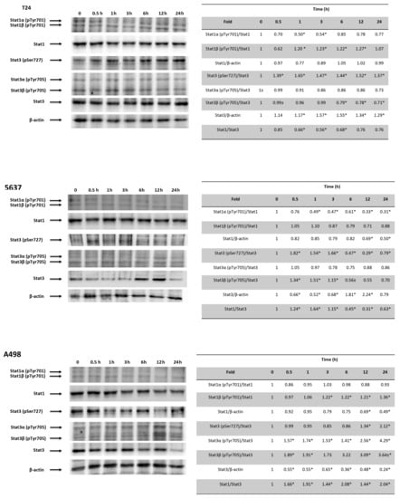 CPS effects on Stat1 and Stat3 activation. Western blot analysis of Stat1, Stat1α (pTyr701), Stat1β (pTyr701), pStat3 (pSer727), Stat3α (pTyr705), Stat3β (pTyr705) and Stat3 protein expression in T24, 5637 and A498 cell lines treated with 50 μM CPS for 12 and 24 h. Blots are representative of one of three separate experiments. Stat1α (pTyr701) and Stat1β (pTyr701) densitometry values were normalized to Stat1. Stat3 (pSer727), Stat3α (pTyr705) and Stat3β (pTyr705) densitometry values were normalized to Stat3. Stat1 and Stat3 densitometry values were normalized to β-actin, used as the loading control. Stat1 and Stat3 protein levels of treated cells were determined with respect to their levels in untreated cells. No differences were observed between untreated cells and vehicle-treated cells. Data are representative of three different experiments; * p < 0.01. Detailed information about the Western blotting can be found in Figure S11.