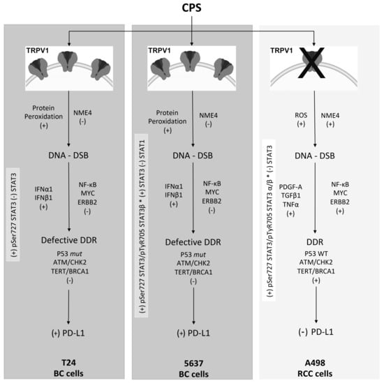 Here, we evidenced that CPS-induced TRPV1-mediated DSB DNA damage is associated with an increase in Stat3 (pSer727) in CPS-treated T24 and 5637 cells. pTyR701-Stat1β and reduced pTyR701-Stat1α levels were evidenced in CPS-treated T24 cells. An increase in the pTyR705-Stat3β levels and a progressive reduction of the pTyR701-Stat1α levels were observed in CPS-treated 5637 cells. Finally, a progressive increase of pTyR701-Stat1β and pTyR705-Stat3β up to 24 h was evidenced in CPS-treated A498 cells. However, activation of Stat1 or Stat3 is not sufficient to predict Stat effects. Indeed, the phosphorylation levels may also depend on the ratio between Stat1 and Stat3 proteins, with Stat1 counteracting the pro-tumorigenic Stat3 signaling [70,71]. In BCs, Stat3 is implicated in the progression from carcinoma in situ to invasive BCs. Stat3 signaling acts downstream of inflammatory cytokines released during bladder tumorigenesis; Stat3 activation is directly related to the malignant behavior of T24 BC cells, and inhibition of pStat3 levels reduces T24 cell invasion [72]. Moreover, Stat3 is also involved in RCC carcinogenesis [72]. In this scenario, CPS-induced PD-L1 reduction is associated with a Stat1highStat3low phenotype in A498 cells and a Stat1lowStat3high phenotype in CPS-treated T24 cells, whereas an early decrease in the Stat1/3 ratio, followed by a delayed increase, was observed in CPS-treated 5637 cells. Finally, mounting evidence suggests that high hTERT activity is tightly associated with Stat3 activation, cancer progression and poor outcomes, and Stat3 knock-out downregulates hTERT expression [73].
