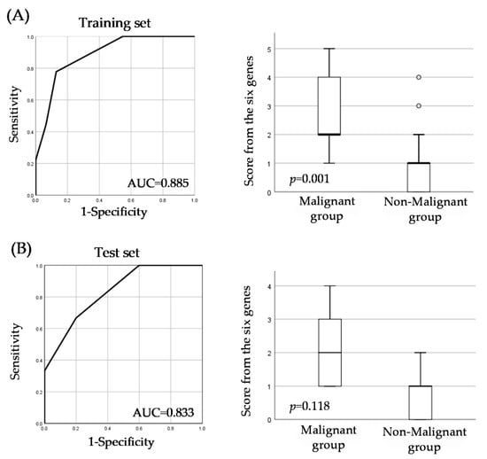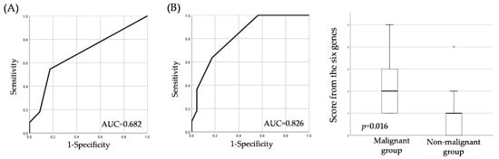 | Sample Set | Cutoff * | Malignant Group | Non-Malignant Group | Sensitivity | Specificity | PPV | NPV | Fischer’s Exact Test | AUC |