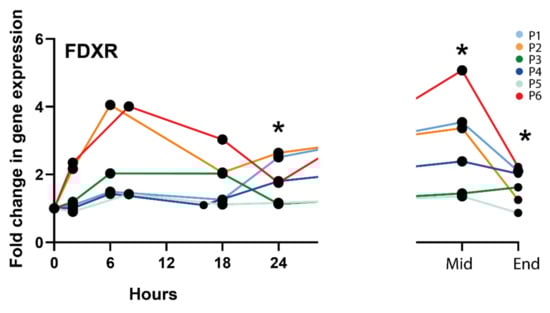 FDXR expression profile in all radiotherapy patients. * Significantly different from control (before treatment) (paired t test, p ≤ 0.05).