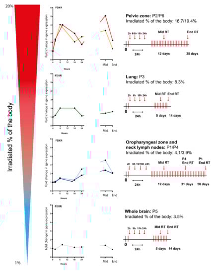 Therefore, the FDXR expression profiles for all types of radiotherapy cancer patients (lung, neck, brain, and pelvis) were presented individually in decreasing order of irradiated body % (Figure 2); a schematic radiotherapy schedule has been included for each irradiated area. Following the first fraction, although the calculated physical dose to the blood was very low, an upregulation of FDXR gene transcription was detectable after 2 h and was clearly dependent on the dose from the lowest irradiated percentage of the body (3.5%, whole brain) to the highest, (up to 19.4%, pelvic zone) reaching a peak at 6–8 h for all patients except P1 and P4 (oropharyngeal zone and neck lymph nodes) where the maximum upregulation was at 24 h. After multiple fractions (mid-RT), the expression level increased further or reached a plateau phase and was still significantly up-regulated at the end of RT.