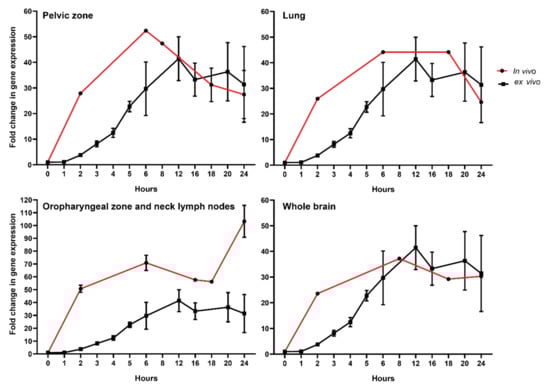 To further compare directly both data sets, we corrected the in vivo data with a factor corresponding to the ratio of dose (i.e., dose to the blood calculated for in vivo samples corrected to 2 Gy used in vitro) (Figure 3). This was possible because the dose response for FDXR RNA expression increase linearly with the dose in this dose range both in vitro and in vivo [41]. The data were presented for each of the four RT-treated cancer types. Remarkably, the reconstructed temporal response was consistent with the one obtained in vitro. Overall, we discovered a good correlation in the kinetics of expression from the 8-hour time point onward, indicating no major differences in transcriptional changes in vitro and in vivo. The temporal peak of expression response of FDXR was conserved across patients. One exception was for the oropharyngeal zone and neck lymph nodes (Figure 3) where the in vivo calculated doses were associated with higher fold change in FDXR gene expression in vivo than in cells exposed in vitro. At earlier time points, however, a difference in the dynamics of RNA expression can be seen, which suggests that different mechanisms may be acting in the first hours.
