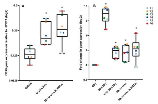 The kinetics of apoptotic death induced by IR in human leukocytes has been studied extensively. Apoptosis in lymphocytes is activated 12–14 h after IR either in vivo or ex vivo; it reaches a maximum at 18–24 h and reduces after 48 h; [74,75,76,77,78,79,80,81,82,83,84,85,86]. T- and B-lymphocytes are the most radiation-sensitive cells in the body [44]. Hammi and colleagues [46] reported that after the first fraction (2 Gy at 2 Gy/min), the calculated mean dose to the blood was very low, 0.004 Gy for IMRT and the volume of blood receiving any dose after one fraction was 18.4%. After 30 fractions, the highest dose to 1% of blood was calculated to be 0.343 Gy. Falcke et al. found that B-lymphocytes and natural killers (NK) were more radiosensitive than T-lymphocytes. Twenty-four hours after irradiation, these cells indicated decreases in viability by 10–15% for a dose of 0.7 Gy. Later (48 h), this decrease reached 40–50%, up to 70% at 72 h [87]. Cell death should not be contributing to the responses observed at 24 h, considering how extremely low the blood doses calculated are. It should be noted that we used isolated PBMCs for in vitro studies while all leukocytes (PBMCs plus granulocytes) were lysed in PAXGene tubes. However, no significant differences in FDXR expression were found between WBC and PBMCs at 24 h following a 2 Gy dose [88].