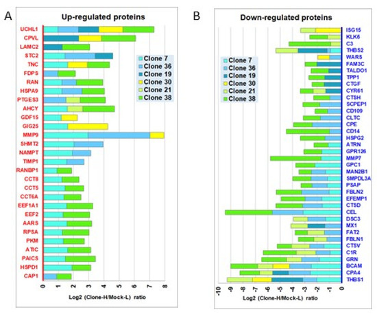 Distribution of multiple converging up- or down-dysregulations of secreted proteins across the 6 KRAS-clones (H), each paired with a Mock (L) sample, obtained by SILAC MS quantitative proteomics. Cutoff for dysregulation: log2 ratios (H/L) exceeding ±0.8916. (A) All the 29 upregulated proteins. (B) All the 38 downregulated proteins.