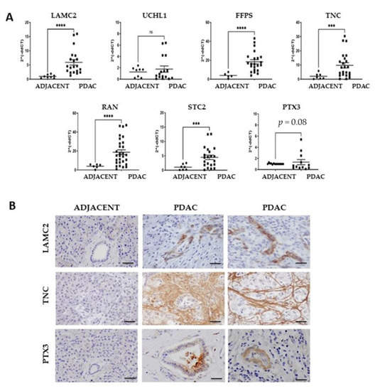 Expression of candidate biomarker proteins in surgical PDAC tumor samples. (A) mRNA expression levels of LAMC2, TNC, PTX3, FPPS, UCHL-1, STC2 and RAN in surgical specimens of PDAC (n = 21) and in the non-involved adjacent pancreas (n = 16). Statistical analysis: parametric t-test with Welch’s correction, *** p < 0.01, **** p < 0.001. (B) Representative images of immunohistochemistry for LAMC2, TNC and PTX3 in PDAC surgical samples and adjacent pancreatic tissues showing positive immunostaining in tumor cells and also for TNC in the stroma.