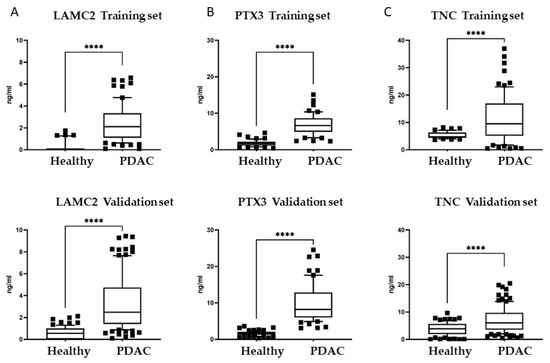 Plasma levels of LAMC2, PTX3 and TNC in pancreatic cancer patients and in healthy donors. Two cohorts were tested, Training set: PDAC n = 78 patients, Healthy n = 53 donors; and Validation set: PDAC n = 122 patients; Healthy n = 82 donors. Plasma concentrations were measured by ELISA: (A) LAMC2, (B) PTX3 and (C) TNC. Statistical analysis: parametric t-test with Welch’s correction, outliers eliminated with «Identifying outliers» ROUT, **** p < 0.0001. Boxes correspond to values comprised between 10 and 90 percentiles.