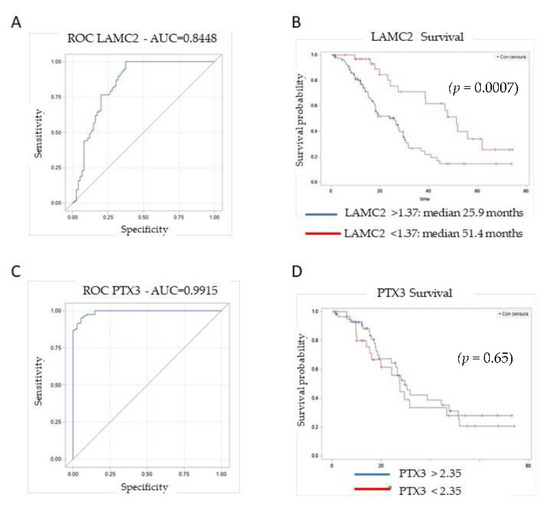 Sensitivity and specificity of (A) LAMC2 and (B) PTX3, analyzed by the Area Under the Curve (AUC) of the Receiver Operating Characteristics (ROC) curves. Analyses include PDAC patients (n = 200) and healthy individuals (n = 75). Association of biomarker levels of (C) LAMC2 and (D) PTX3 with patient survival rate, considering 148 effectively resected PDAC patients (52 were considered non-resectable at the time of surgery). PDAC patients with circulating levels of LAMC2 <1.37 ng/mL had a significantly longer median survival time of 51.4 months compared to patients with LAMC2 >1.37 ng/mL, which had a median survival time of 25.9 months. Statistical analysis: Kaplan–Meier method (p = 0.0007). For PTX3, with a threshold value of 2.35 ng/mL, the survival curves of patients with high or low PTX3 levels were not significant (p = 0.84).
