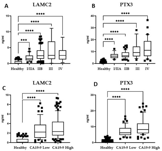 We next considered whether the identified biomarkers could stratify PDAC patients according to the stage of the disease. This is of particular importance in pancreatic cancer, as surgery requires the detection of a small tumor not yet progressed. Patients were divided into early-stage tumors (I/IIA and IIB) and late-stage tumors (III and IV), as detailed in Table I. Levels of LAMC2 were significantly higher in early-stage I/IIA and IIB PDAC (n = 127) than in healthy individuals (**** p < 0.0001) (Figure 5A). Similarly, in early-stage tumor patients, PTX3 levels were higher than controls (**** p < 0.0001) (Figure 5B), indicating that both LAMC2 and PTX3 are already altered in the earliest stages of PDAC.