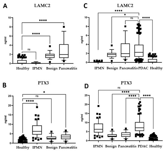 We next explored the quantification of biomarkers in plasma samples of patients with benign pancreatic tumors (cystadenoma, n = 21), in patients with chronic pancreatitis undergoing surgery (n = 15), and in patients diagnosed with Intraductal Papillary Mucinous Neoplasm (IPMN) (n = 52), a recognized pre-cancerous condition that is important to detect [47,48]. Levels of LAMC2 were significantly higher in cystadenoma and pancreatitis patients compared to healthy donors (p < 0.0001) (Figure 6A). PTX3 was significantly higher in pancreatitis (p < 0.05), but not in cystadenoma (Figure 6B). Patients with IPMN had very high levels of PTX3 compared to healthy donors (p < 0.0001) (Figure 6B), but not of LAMC2 (Figure 6A). These findings suggest that a pathological derangement in pancreatic tissues already triggers the release of these two proteins into the bloodstream (in particular, LAMC2 in cystadenoma and pancreatitis, and PTX3 in IPMN), and that further diagnostic imaging is warranted. It must be noted, however, that the biomarker levels were significantly more elevated in patients with PDAC compared to patients with non-neoplastic conditions, as depicted in Figure 6C,D, with two exceptions: pancreatitis patients had high levels of LAMC2 that were similar to levels in PDAC patients, and PTX3 was already high in IPMN patients. This latter finding suggests that PTX3 quantification cannot discriminate between patients with IPMN or PDAC, but could be useful as a potential biomarker of pancreatitis.