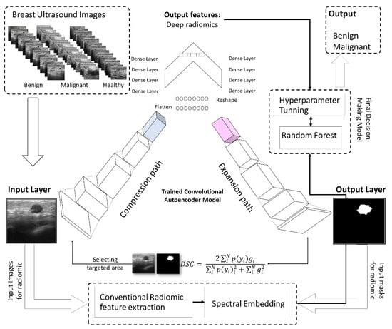 In this study, we propose a convolutional deep autoencoder model with dual-purpose applications for segmenting and simultaneously extracting concise deep radiomics of the breast lesions. The generated radiomics are employed to diagnose breast cancer in ultrasound imaging. In the training phase, the segmented breast lesions have been provided to the model. After that, in the testing phase, the model performs segmentation while generating low dimension radiomics, known as latent space features. The loss function is measured as a distance between the model-segmented area and the ground truth. Our model’s parameters are optimized using a stochastic gradient descent algorithm trying to minimize the similarity distance and make sufficient segmentation. Figure 1 and Figure 3 show the workflow of the proposed approach in terms of model configuration and radiomic throughput, respectively.
