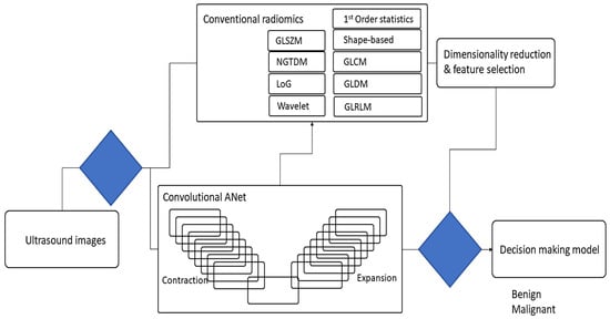 Computer-aided decision (CAD) systems showed undeniable help to physicians due to recent advancements in artificial intelligence (AI) technology [11,12,13,14]. Particularly, embedded advanced machine learning models, i.e., deep neural networks, helped boost the capabilities of CAD [15]. Important parameters for the diagnosis of breast cancer are related to tumor morphological information, which is often checked by physicians, and baseline characteristic features verified by CAD [13,14]. Imaging throughputs, or radiomics, decode information on the characteristics that were not visible to the naked/untrained eyes and can have significant effects on cancer diagnosis/prognosis [16,17,18,19,20,21,22,23].