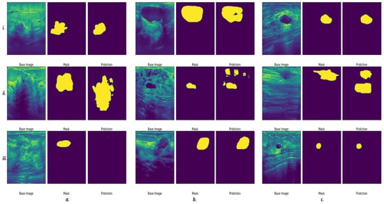 In total, 780 ultrasound images—437 benign, 210, malignant, and 133 normal—were used as the input for this system. This set was divided at random into training and testing sets, having 635 and 145 cases, respectively. We used the proposed deep learning structure for 2D ultrasound imaging segmentation. The input ultrasound images dimensions were 512 × 512, which were normalized before feeding them to the model. A convolutional layer, batch normalization, and a rectified activation linear unit (ReLu) layer were used for all input images. In the contracting path, all consecutive convolutional layers had a filter size of 3 × 3 and pooling layers of 2 × 2 shrunk the 512 × 512 input spatial dimension to 32 × 32 dimensions at the end of the encoder. Then, 16 filters were used in the convolutional layer to convolve the input ultrasound image, which used the same size padding with a 2 × 2 stride. The model applied a mirrored architecture for the decoder (expanding path) without skip connection (bridges) between two paths, as shown in Figure 1 and Figure 2. For upsampling data, a 3 × 3 kernel size deconvolved the contracted images. The networks overall number of trainable parameters was 190,279,473, with 512 maximum channels. The Adam optimizer was used for the training of all models with a modifying learning rate of to. The models were trained for 150 epochs with a batch size of 8 for the training cohort of patients. The proposed deep learning model was implemented with the TensorFlow library in Python programming language [51,52]. The results of segmentation were attained throughout the inference process using Dice score similarity of the predicted lesions to the ground truth labels, which reached close to 85.7% and 70% for the training and validation sets, respectively. During training, the value of the Dice coefficient fluctuates approximately from 42% to 55% during the first 20 epochs, then increased and stabilized after the 70th epoch. To avoid overfitting, we kept training the proposed model in the 150 epochs range. Then, this trained model was used to segment the breast lesions for other patients’ strata and generated masks for them while extracting deep radiomics simultaneously. Figure 4 and Figure 5 show the results of segmentation with training and validation loss, and the accuracy of the training for 150 epochs, respectively. The result of computational time of the proposed model is presented in Table S1 in the Supplementary Material Section. In Figure 4, some examples of successful (a.i, c.i, b.iii, c.iii), partially-successful (b.i, a.ii, b.ii, c.ii) and unsuccessful segmentations (a.iii) are presented. The results indicate that the model tends to have more false positive errors than false negatives.