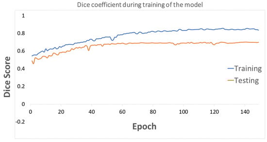 The Dice coefficient loss score is presented for training and testing the model during 150 epochs.