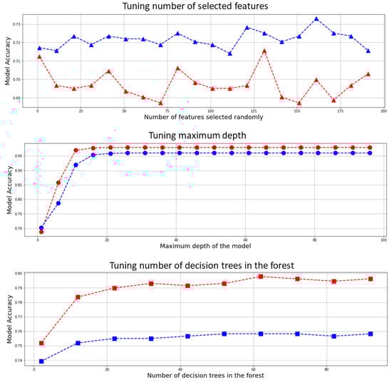 Hyperparameters of the random forest model were playing important role in classifying breast lesions. These hyperparameters consisted of the number of decision trees in the forest, the maximum depth of the model, and the number of features considered by each tree when splitting a node. To obtain the optimum hyperparameters, we tuned the model for all the possible degrees of freedom through an empirical evaluation for each combination. Figure 6 presents the variations in accuracy corresponding to each change in hyperparameter.