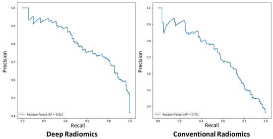 The representation of conventional and deep radiomic features for the training random forest model for diagnosis of breast cancer with the respect to precision and recall.