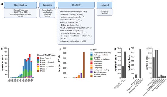 CAR-T cells on clinical trials. (a) Flow chart of the systematic review methodology showing the keywords, duplicate removal, and eligibility criteria applied as filters. (b) Number of trials by design type along the years. (c) Overall status of clinical trials applying CAR-T cells. (d) Multicenter or unicenter studies as described by each trial or observed by locations. (e) CAR-T cell source used in trials. The majority of trials described autologous, allogeneic cord blood (n = 1), and allogeneic or autologous T cells (n = 2). (f) Funding support described for clinical trials.