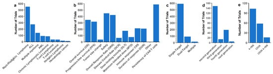 CAR-T cell strategy for hematological malignancies under clinical trial evaluation. (a) Hematological malignancies treated by CAR-T cells under clinical trials (non-Hodgkin’s lymphomas including DLBCL, MCL, Follicular lymphoma, mediastinal large B cell lymphoma, B cell lymphoma, CLL, and Small Lymphocytic Lymphoma). (b) Primary and secondary endpoints of clinical trials. All endpoints for a given trial are presented in this graph. (c) Number of simultaneous targets by one CAR or combination of different CAR-T cells delivered at once or in sequence for the patients. Multiple includes three or more targets at once. Several targets for multiple patients were considered as single-target therapy. (d) CAR generation used in clinical trials. (e) Number of clinical trials with CD28 and/or 4-1BB costimulatory signal on CAR constructs.