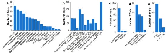 CAR-T cell strategies for solid tumors under clinical trial evaluation. (a) Solid tumors treated by CAR-T cells under clinical trials. The term “Advanced solid tumors” was applied when the trial description used the same terminology, and the tumor origin could not be accessed. If the trials described several tumors, all of them were marked as separated entities. (b) Primary and secondary endpoints of clinical trials. All endpoints for a given trial are presented in this graph. (c) Number of simultaneous targets by one CAR or combination of different CAR-T cells delivered at once or in sequence for the patients. ‘Multiple’ includes three or more targets at once. Several targets for multiple patients were considered as single-target therapy. (d) CAR generation used in clinical trials. (e) Number of clinical trials with CD28 and/or 4-1BB costimulatory signal on CAR constructs.