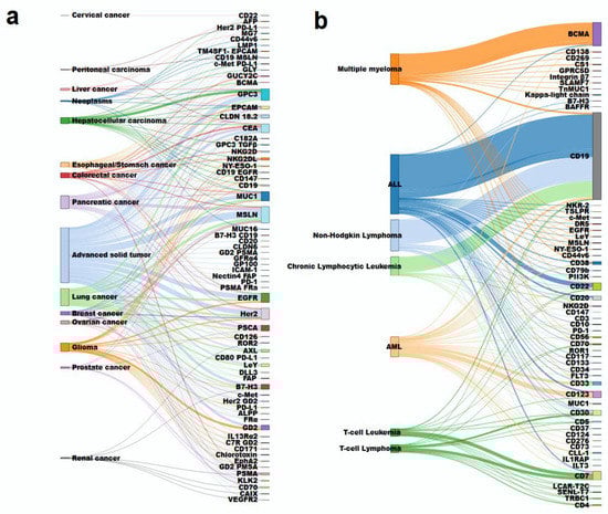 Disease and target antigen combination for CAR-T cell clinical trials. (a) Solid tumors are depicted on the left and the target on their right. The term “Advanced solid tumors” was attributed when the malignancy was not described in the trial. (b) Hematologic malignancies and the corresponding targets used in CAR-T cell trials. The line colors are according to the tumors, each line representing one study. The bar thickness is according to the number of studies of tumor or target.