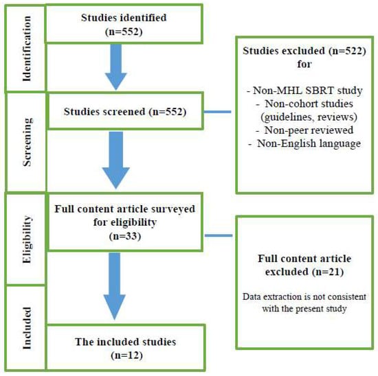 The flowchart for screening the eligible studies. Abbreviations: MHL: mediastinal-hilar lymph node; SBRT: Stereotactic body radiation therapy.