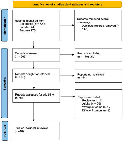 For this systematic review, we searched the databases PubMed and Embase and included articles in English from their induction until the 1st of March 2022. We created a search string including the keywords ‘liquid biopsy’ or ‘cf-DNA’ or ‘ct-DNA’ and ‘brain tumor’ (Figure 1). We included randomized trials, retro- and prospective cohort studies, as well as case series, but excluded reviews and technical reports. We only included studies describing solely PBTs, which we defined as patients <20 years. After removal of duplicates, which was done with the help of the web-based software Rayyan [17], all articles were screened according to their titles by two authors independently (L.G. and N.F.). Thereafter, the remaining articles were assessed according to their abstracts and full-texts by L.G. and N.F. independently and a final list of articles was compiled. In case of a disagreement concerning the in- or exclusion of a study, the senior author (J.S.) took the final decision. This review was performed in accordance with the Preferred Reporting Items for Systematic Reviews and Meta-Analyses (PRISMA) guidelines and registered with the research registry (ID number 7820) [18].