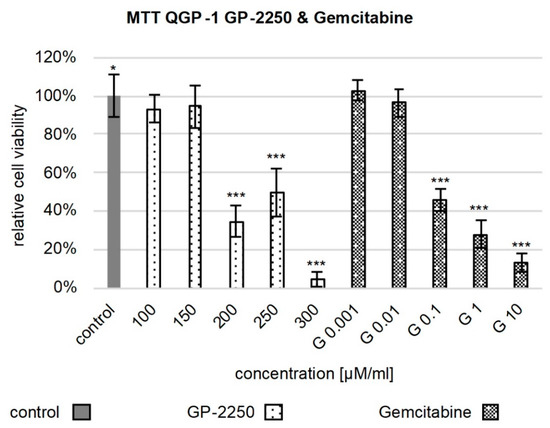 Cell viability assay of QGP-1 monotherapy. Figure 1 shows the reduction in cell viability observed in the MTT assay after treatment with 100 µM GP-2250, 150 µM GP-2250, 200 µM GP-2250, 250 µM GP-2250, 300 µM GP-2250, 0.001 µM Gemcitabine, 0.01 µM Gemcitabine, 0.1 µM Gemcitabine, 1 µM Gemcitabine and 10 µM Gemcitabine compared to the untreated control. Error bars show the standard deviation. p-values are indicated as follows: *** p ≤ 0.001, * p ≤ 0.05.