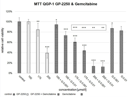 Cell viability assay of combination therapy in QGP-1. Figure 2 shows the reduction in cell viability observed in the MTT assay of the combination therapy of 100 µM GP-2250 + 0.001 µM Gemcitabine, 100 µM GP-2250 + 0.01 µM Gemcitabine, 175 µM + 0.001 µM Gemcitabine, 175 µM GP-2250 + 0.01 µM Gemcitabine, 200 µM GP-2250 + 0.001 µM and 200 µM GP-2250 + 0.01 µM Gemcitabine in comparison to the untreated controls and the monotherapy with 100 µM GP-2250, 175 µM GP-2250, 200 µM GP-2250, 0.001 µM Gemcitabine and 0.01 µM Gemcitabine. Error bars show the standard deviation. p-values are indicated as follows: *** p ≤ 0.001, ** p ≤ 0.01, * p ≤ 0.05. p-values above each column indicate the levels of significance in comparison to the untreated controls. p-values in the grey frame indicate the levels of significance of the combination compared to each single concentration in the monotherapy.