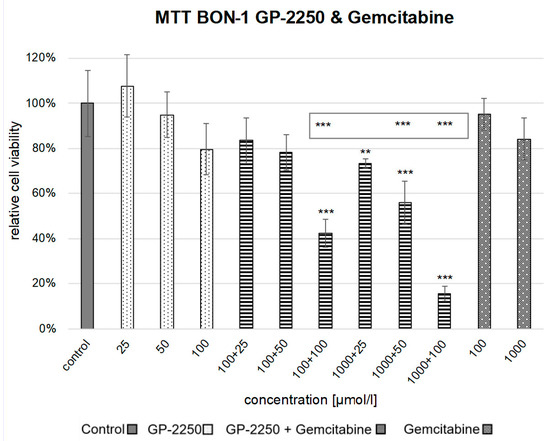 Cell viability assay of the combination therapy in BON-1. Figure 3 shows the reduction in cell viability observed in the MTT assay of the combination therapy with 25 µM GP-2250 + 100 µM Gemcitabine, 50 µM GP-2250 + 100 µM Gemcitabine, 100 µM GP-2250 + 100 µM Gemcitabine and 25 µM GP-2250 + 1000 µM Gemcitabine, 50 µM GP-2250 + 1000 µM Gemcitabine and 100 µM GP-2250 + 1000 µM Gemcitabine in comparison to the untreated controls and the monotherapy with 25 µM GP-2250, 50 µM GP-2250, 100 µM GP-2250, 100 µM Gemcitabine and 1000 µM Gemcitabine. Error bars show the standard deviation. p-values are indicated as follows: *** p ≤ 0.001, ** p ≤ 0.01. p-values above each column indicate the levels of significance in comparison to the untreated controls. p-values in the grey frame indicate the levels of significance of the combination compared to each single concentration in the monotherapy.