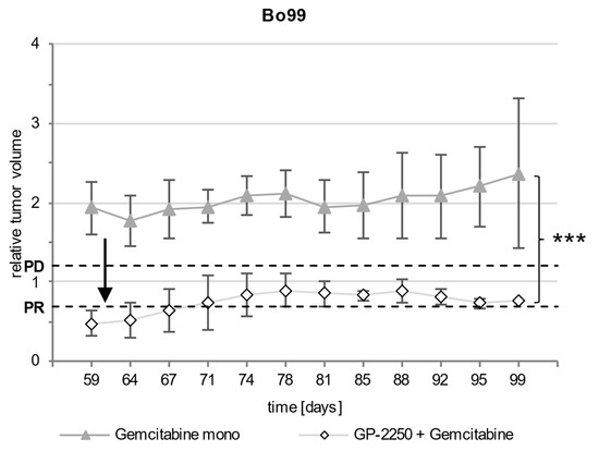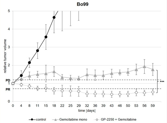 Development of the relative tumor volume of Bo99 during the observation period. Figure 4 shows the development of the relative tumor volume during the observation period of Bo99 tumors treated with Gemcitabine mono and a combination of Gemcitabine and GP-2250 in comparison to the untreated controls. PD, progressive disease; PR, partial response. Error bars show the standard deviation. p-values are indicated as follows: *** p ≤ 0.001.