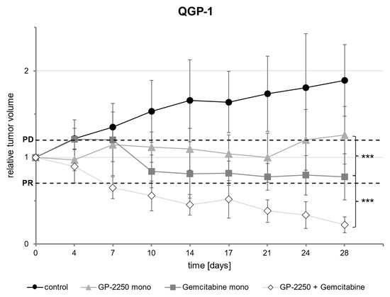 For this study, 6-week old female NMRI Foxn1nu/Foxn1nu mice (Janvier, Saint-Berthevin, France) were used. One week prior to initiation, they were acclimated into a 12 h light cycle-controlled environment. Standard laboratory food and water were allowed ad libitum. Anaesthesia was performed by Isofluran per inhalationem. As described previously, either 5 × 106 QGP-1 [20,24] cells, or tumor tissue fragments in the case of Bo99 [25], were implanted subcutaneously into each flank region. Afterwards, the mice were monitored for general health status and the development of subcutaneous tumors. The tumor volume was calculated as V = ½(ab)2 (a = larger axis, b = smaller axis and a⊥b) via the measurement of the tumor diameter using a caliper. After reaching a tumor volume of 200 mm3, the mice were randomized into several groups: Group 1, controls (n = 6); group 2, GP-2250 monotherapy (n = 6); group 3, Gemcitabine monotherapy (n = 6); group 4, combination therapy GP-2250 and Gemcitabine (n = 6). In Bo99, GP-2250 monotherapy was not performed. The controls received a physiological saline solution, group 2 was intraperitoneally treated with 500 mg/kg*BW GP-2250 three times per week, group 3 was intraperitoneally treated with 50 mg/kg*BW Gemcitabine twice weekly and group 4 intraperitoneally received 500 mg/kg*BW 2250 and 50 mg/kg*BW Gemcitabine thrice and twice weekly, respectively, on alternating days. The tumor volume was measured twice a week. The experiment was terminated when the tumor volume reached 1000 mm3. The tumors were evaluated after 4 and 6 weeks according to the Response Evaluation Criteria in Solid Tumors (RECIST) [3].