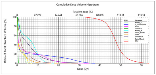 Example of DVH—dose was prescribed as 45 Gy in 3 fractions to the PTV—98% of PTV volume was covered by a dose of 36 Gy (80% of the prescribed dose), the median dose to the PTV was 47.5 Gy, and the maximum dose was 63.7 Gy (141.6% of the prescribed dose).