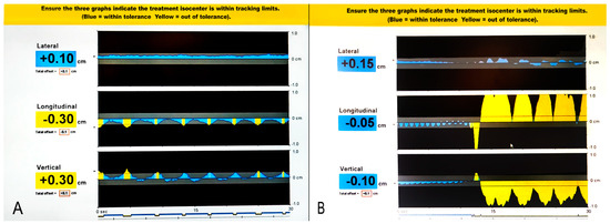 Daily treatments lasted typically between 30–60 min, mostly dependent on patient’s cooperation and ability to hold the breath and/or lie still. There were multiple beam-offs per patient. For patients in DBH there were typically 6–15 breath-holds per fraction, each lasting approximately 20–45 s and the times between them were beam-offs. For patients in FB, there were significantly more beam offs, as the transponders were in the correct treatment position typically 10–15% of the treatment time. Figure 3 presents an example of beam on-off gating during SABR for FB (A) and DBH (B) patients. A permanent beam-off occurred when the transponders permanently moved out of treatment position (according to stated acceptable deviations) and normal breathing or correct breath-hold did not restore the transponders back to treatment position. This was typically due to patient’s discomfort or fatigue (as reported by the patient) or significant bowel movement (as confirmed with CBCT). In either case, an immediate patient repositioning, or a short treatment break, and then patient repositioning were required for restoration of transponders to treatment position. Each patient repositioning was performed using CBCT.