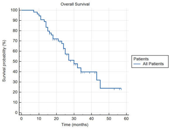 Table 5 summarizes the results for FFLP, PFS, and OS from the diagnosis, and OS from the treatment (OSt). In Figure 4, an actuarial curve for OS is shown.