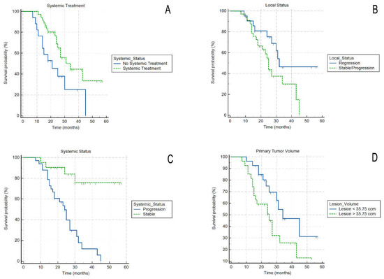 Actuarial curves of survival for: patients receiving/not receiving systemic treatment (A); patients with or without local tumor regression after the treatment (B); patients with or without systemic progression after the treatment (C); and for patients with tumour smaller or larger than median volume (D).