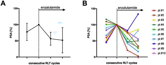 Figure 1. Relative serum PSA course under radioligand therapy prior to (last cycle of conventional PSMA-RLT) and after the start of enzalutamide medication (A) for all patients (mean and standard deviation) and (B) individually for each patient. PSA was normalized to 100% at start of enzalutamide.