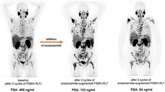 We recently proposed enzalutamide as a potential RLT-enhancing medication (i.e., adjuvant procedure) for boosting PSMA-mediated therapy, describing the significant in vivo upregulation of PSMA expression induced by enzalutamide (re-)exposure, validated by quantitative whole-body [68Ga]Ga-PSMA-11 PET/CT measurements [10,11]. There is also increasing evidence from in vitro studies for a significant PSMA-upregulation effect of ADT and androgen axis drugs [13,14,15,16,17,18]. In addition, Emmett et al. and Aggarwal et al. found corresponding systematic effects of enzalutamide on in vivo PSMA PET imaging [19,20]. Our data presented here indicate the first clinical feasibility of adding enzalutamide to patients with insufficient RLT-induced PSA response to achieve a response (with documented partial remission in 7/10 patients (70%) in our cohort). Besides enzalutamide-induced PSMA upregulation, which was also observed in this patient cohort (Figure 3), we think that the general antitumor effect of the androgen receptor cascade blockade is a significant—and probably the major—contributor to the synergistic effect in patients undergoing PSMA-RLT. It should be noted that PSA response was observed in enzalutamide-naïve patients and individuals previously having failed enzalutamide therapy. To rule out the potentially monotherapeutic effect of enzalutamide, a comparison with a control group receiving only enzalutamide (with no accompanying PSMA-RLT) would be necessary.