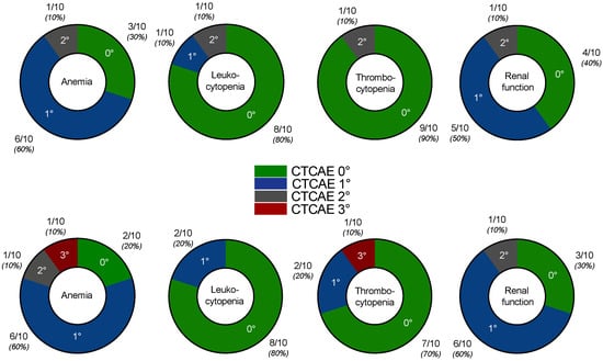 Figure 4. CTCAE grades for anemia, leukocytopenia, thrombocytopenia, and renal function at baseline, i.e., before addition of enzalutamide (upper row) and after two cycles of enzalutamide-augmented PSMA-RLT (lower row).