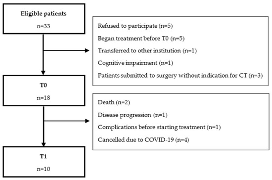 Recruitment started in June 2019, and due to the COVID-19 pandemic, the study was closed in March 2020, with 21 patients recruited (80.8% of the 26 patients presented at the multidisciplinary tumour board that fulfilled eligibility criteria). Three patients submitted to surgery were excluded because they did not fulfil the criteria for adjuvant concomitant chemoradiotherapy. Therefore, 18 patients were assessed at baseline (T0). No patients withdrew from the study. Ten patients completed the T1 evaluation (Figure 1).