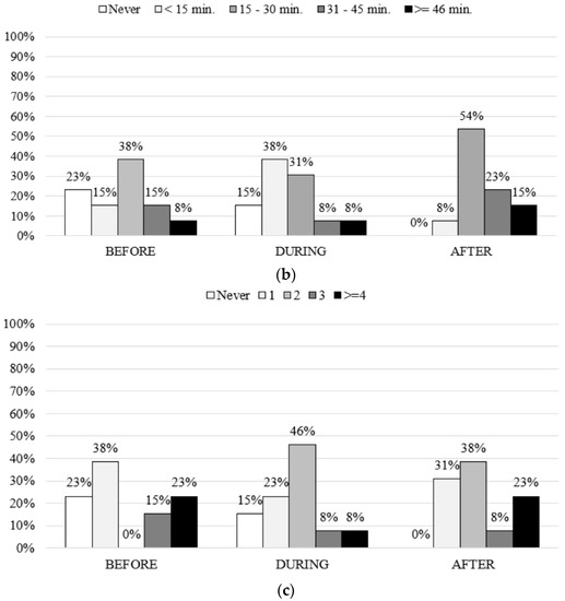 The most common exercise preferences before and during treatment were at a frequency of one to two times/week, 15–30 min/bout at a light intensity. After treatment, patients reported an absolute increase in training frequency, duration, and intensity (most people were willing to participate in an ET program more than two times/week, at moderate intensity and 38.5% for more than 30 min (Figure 3)).