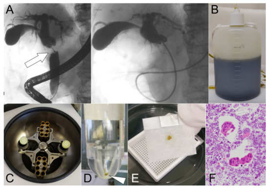 Tissue sections from the CB were prepared using the sodium alginate method (Figure 1) [24]. In brief, (I) bile taken from the bottle was centrifuged at 1500 rpm for 10 min (Figure 2C); (II) only the precipitate was collected and fixed in 10% neutral buffered formalin overnight; (iii) this was centrifuged again at 1500 rpm for 10 min, and the precipitate was fixed in 10% neutral buffered formalin (Figure 2D); (iv) only the precipitate was collected, and then 0.5 mL of 1% sodium alginate was added, agitated, and centrifuged again at 1500 rpm for 10 min; (v) after discarding the supernatant, 1 or 3 drops of 1 M calcium chloride solution were added; (vi) finally, it was embedded in paraffin wax (Figure 2E) and processed to make 3–4 m-thick serial sections for HE staining (Figure 2F) and IHC. For bile smear cytology with Papanicolaou staining, 2–4 glass slides for each patient were prepared. Two pathologists (N.W. and T.T.) and cytotechnologists independently made cytological and histological diagnoses, and then classified the specimens into four categories, namely “absence of atypical cells,” “non-malignant,” “suspicious for malignancy,” and “malignant.” “Suspicious for malignancy” and “malignant” were considered to be positive for cancer. The former two categories, “absence of atypical cells” and “non-malignant,” were considered negative, benign lesions.