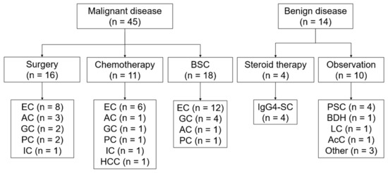 Outline of the process used to reach the final diagnosis. BSC, best supportive care; EC, extrahepatic cholangiocarcinoma; AC, ampullary cancer; GC, gallbladder cancer; PC, pancreatic cancer; IC, intrahepatic cholangiocarcinoma; HCC, hepatic cell carcinoma; IgG4-SC, IgG4-related sclerosing cholangitis; PSC, primary sclerosing cholangitis; BDH, bile duct hamartoma; LC, liver cirrhosis; and AcC, acalculous cholecystitis.