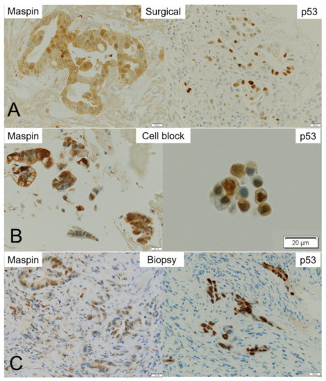 Representative maspin- and p53-immunohistochemistry in the surgical, cell block (CB), and biopsy specimens. Immunohistochemistry of maspin and p53 in (A) surgical, (B) CB, and (C) biopsy specimens. While maspin staining is found in almost all malignant cells in the surgical specimen, p53 staining is sparse in the nucleus of cancer cells. (A) Although nuclear positivity of maspin is clearly observed in adenocarcinoma cells, p53 expression is weak in their cytoplasm and sparse in the nucleus of cancer cells. (B) Maspin is strongly positive in the cytoplasm of adenocarcinoma cells in the CB specimen. On the contrary, the cancer cell nuclei are sparsely stained with p53. (C) Maspin staining is positive in the cytoplasm and/or nuclei of adenocarcinoma cells in a biopsy specimen. p53 staining is positive in the nuclei of cancer cells.