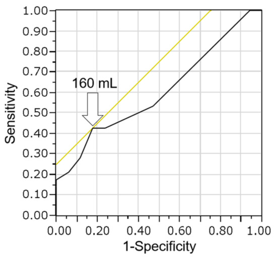 Noda et al. [20] previously reported the efficacy of the CB method with a small amount of bile for the diagnosis of bile duct cancer. They collected bile through a catheter with negative pressure using a 10 mL syringe during the ERC procedure. They reported that the sensitivity (52.9%) of the CB method was significantly higher than that (27.9%) of smear cytology (p = 0.014). In the current study, a large amount of bile was used to prepare the CB specimen, resulting in high diagnosis sensitivity (62.2%). We also evaluated whether there is a relationship between the bile volume and diagnosis of malignancy using the CB method in 45 malignant cases. In the receiver operating characteristic (ROC) curve analysis of bile volume and diagnosis of malignancy, the area under the curve (AUC) was 0.61. The optimal cutoff was calculated to be 160 mL, with a sensitivity of 43% and specificity of 82% for the diagnosis of malignancy (Figure 6). When the cutoff value was set at 160 mL, there was no significant difference between the high (≥160 mL) and low (<160 mL) volume bile groups (p = 0.28). The reason why there was no significant difference is believed to be the fact that very few cases were examined employing the cell block method using a small amount of bile because overnight-stored bile was used.