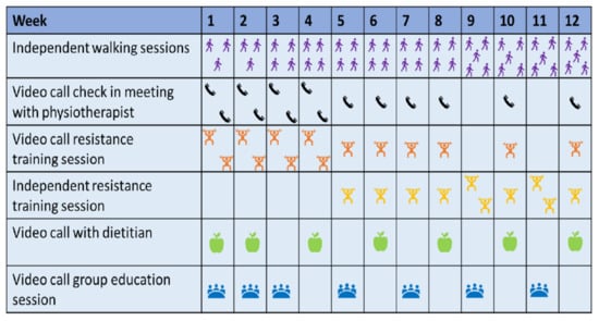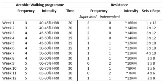 - Aerobic and resistance exercise. Aerobic training was a walking programme of increasing frequency, duration and intensity (Figure 2), with heart rate targets individually prescribed using heart rate reserve (HRR), which was calculated as follows: 220—age = Max HR, Max HR—resting HR = HRR. Participants used Polar M200 heart rate monitor watches and the Polar Flow smartphone application (app) (Polar Electro Oy, Kempele, Finland). Researchers could remotely monitor walking data (duration, distance, speed, max heart rate, average heart rate) through shared access to the Polar Flow app. This information was used to set individualised goals with participants and to inform progressions of the walking plan. All equipment required for the exercise intervention was provided by the research team. Participants attended online supervised group resistance training sessions with a physiotherapist twice weekly. The resistance training programme used in these sessions (Figure 2) was developed for the ReStOre II randomised controlled trial [24] and was based upon a knowledge of participants’ 1-repetition maximum (1-RM) for each movement. From week 5, there was a structured, gradual transition from supervised to independent training (Figure 2), which was designed to promote self-management and long-term engagement exercise.