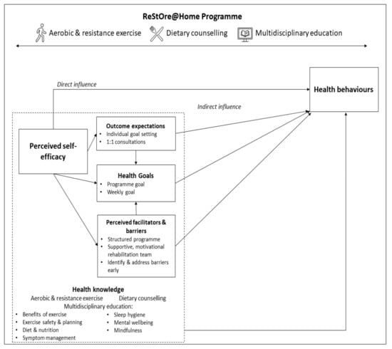 The design of ReStOre@Home is grounded in social cognitive theory (SCT), which posits that a person’s perceived self-efficacy influences health behaviours directly and also indirectly, through the impact of self-efficacy on goals, outcome expectation and perception of facilitators and barriers [45,46]. The core determinants of the theory which interact to produce changes in health behaviours are: perceived self-efficacy, knowledge of health risks, outcome expectations, health goals, perceived facilitators and socio-structural impediments. The design of ReStOre@Home addresses these core determinants as shown in Figure 3. Each component of the programme was designed to improve health knowledge and self-efficacy and therefore elicit a positive direct and indirect influence on health behaviours. Through the application of SCT, ReStOre@Home aims to enable participants with a greater self-efficacy over their recovery and to achieve healthy, lasting, lifestyle changes.