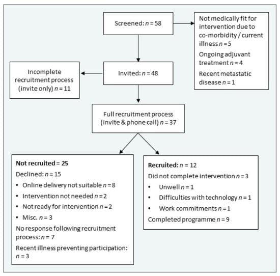 A recruitment target of n = 12 was based on sample size recommendations for pilot studies by Julious et al. [41]. Similar sample sizes are seen in comparable cancer rehabilitation pilot studies [42,43,44]. Inclusion criteria were: