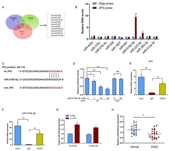 3.4. JPX Functioned as a Sponge of miR-516b-5p in ESCC